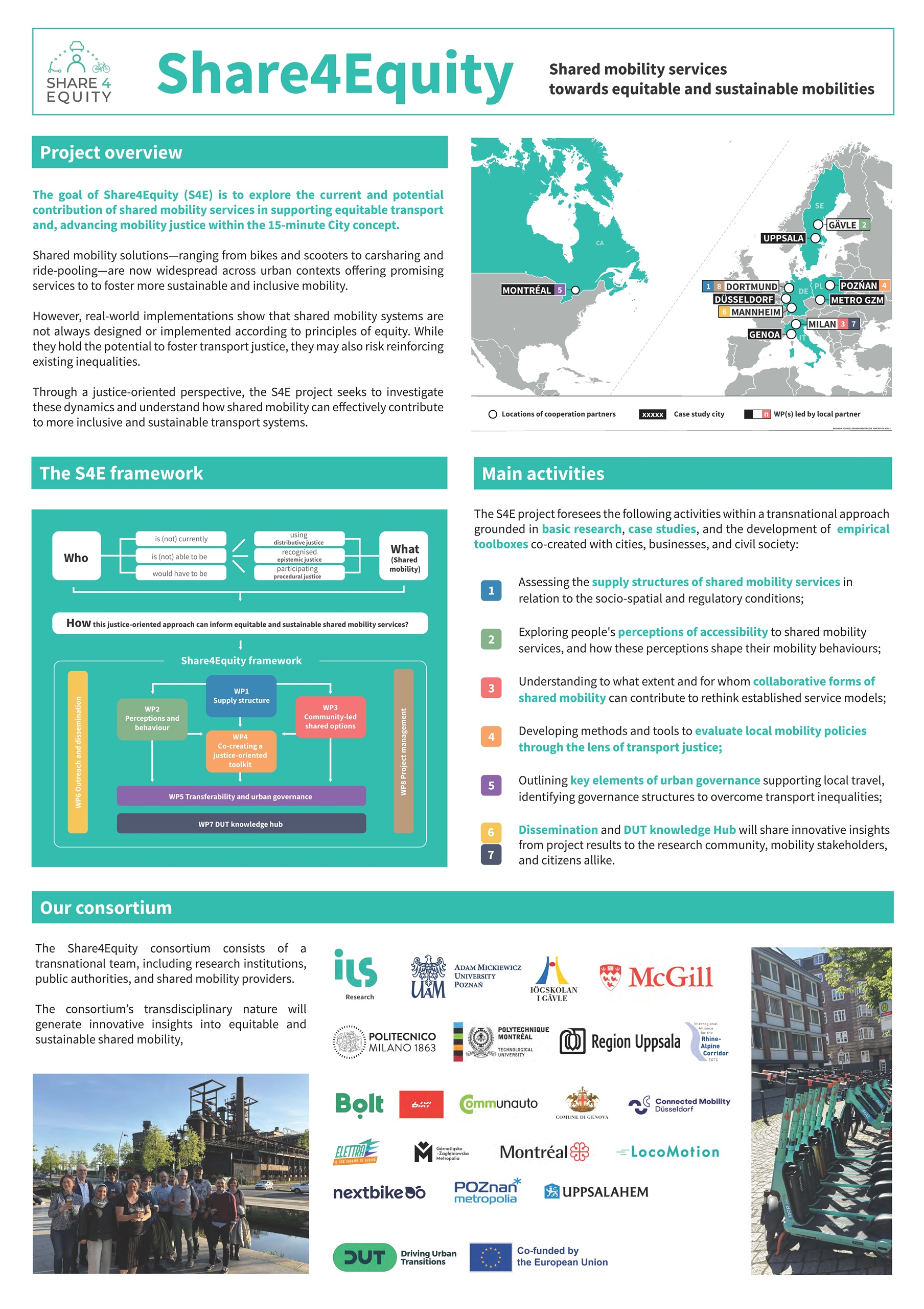 Share4Equity explores the current and potential contribution of shared mobility services in supporting equitable and sustainable transport solutions and in advancing mobility justice within the 15-minute City concept.